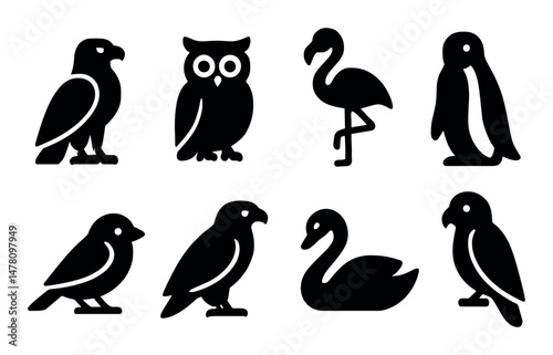 Fototapeta premium Bird icons set, silhouette style, featuring owl, penguin, flamingo, professional for web and app