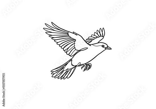 Fototapeta premium Bird in flight drawing. This black and white outline illustrates a bird in mid-flight, showcasing its dynamic wings spread wide as it soars. Vector sketch line art draw.