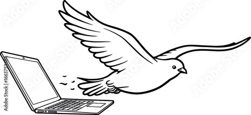 Naklejka premium Bird in flight emerges from laptop: symbol of digital freedom