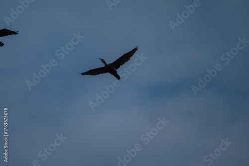 © Krzysztof, Fototapeta premium Bird in Flight Silhouette Against Muted Blue Sky