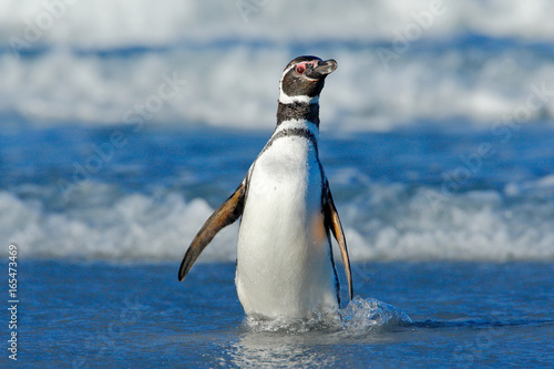 © ondrejprosicky, Obraz premium Bird in the wave. Penguin in the water. Bird in the sea waves. Penguin swiming in the waves. Sea bird in the water. Magellanic penguin in ocean wave in the background, Falkland Islands, Antarctica.