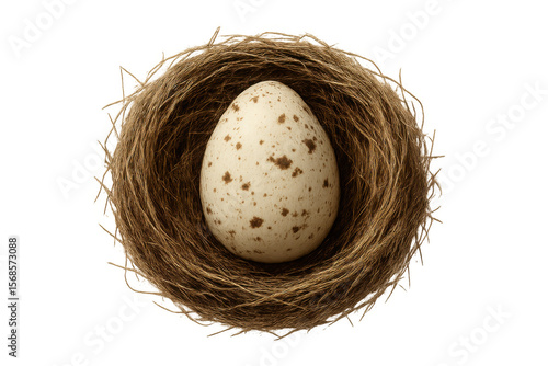 © Michael, Obraz premium Bird nest cradling a single speckled egg, isolated on a transparent background, ready for compositing