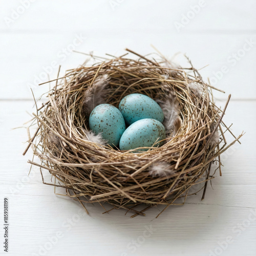 © YZ Visual Studio, Obraz premium Bird nest with blue eggs on white wooden background for spring nature concept
