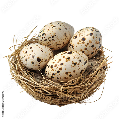© vanilnilnilla, Fototapeta premium Bird Nest with Speckled Eggs on Plain White Isolated Background
