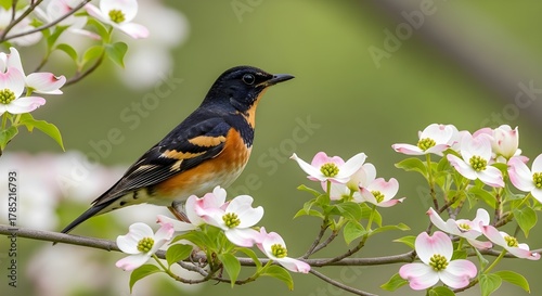 © Javed, Fototapeta premium Bird perched on a flowering dogwood branch outside