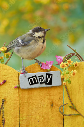 Fototapeta premium Bird perched on an May decorated fence