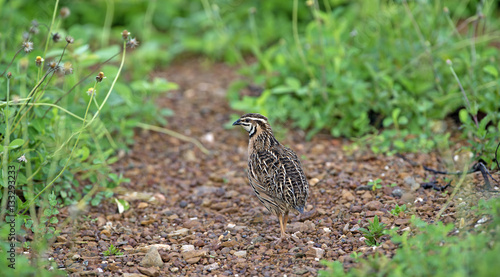 © Nuwat, Fototapeta premium Bird, Rain Quail (Cotumix coromandelica) on the floor with little tree, Beautiful bird