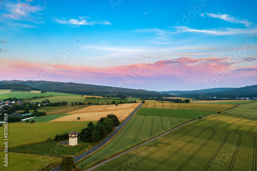 Fototapeta premium Bird's eye view of a replica of a Roman watchtower on the Limes near Idstein in the Taunus at sunset