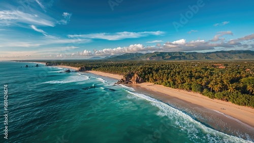 © TheWaterMeloonProjec, Fototapeta premium Bird's-eye view of a serene beach scene with lush surroundings