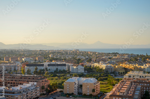 Fototapeta premium Bird's eye view of Denia city and roofs at dusk. On the horizon you can see the ocean and the mountains on the Mediterranean coast