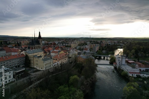 Naklejka premium Bird's eye view of Louny city on a bank of a river in Czech Republic on a cloudy day
