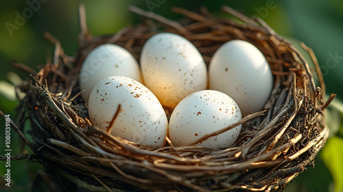 Fototapeta premium Bird's Nest with Five White Eggs - Photo