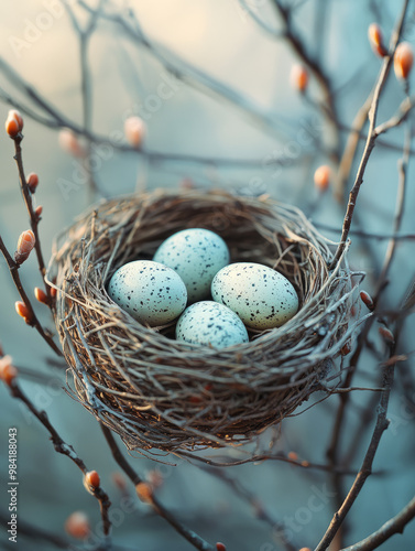 Obraz premium Bird's nest with speckled eggs among budding branches.