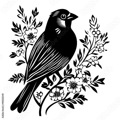 © The Illustraitor, Naklejka premium Bird silhouette on a branch with floral elements woodcut style birds logo design