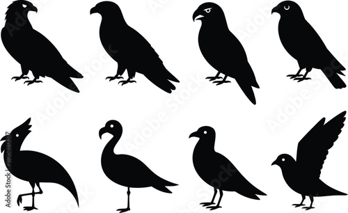 Naklejka premium Bird silhouettes, raven, parrot, flamingo, seagull, bird vector icons