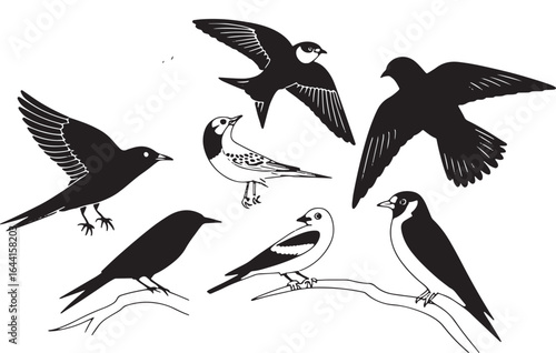 Obraz premium Bird Silhouettes Vector Set Diverse Avian Species Flying Perching Wildlife Illustration