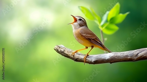 Fototapeta premium Bird singing on branch, lush green forest background, nature photography, perfect for website banners