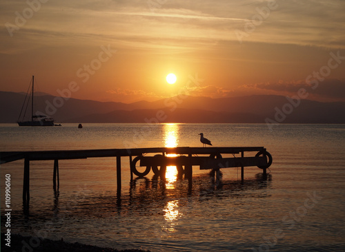 © Lea, Fototapeta premium Bird sitting on a dock in front of the rising sun in Corfu, Greece