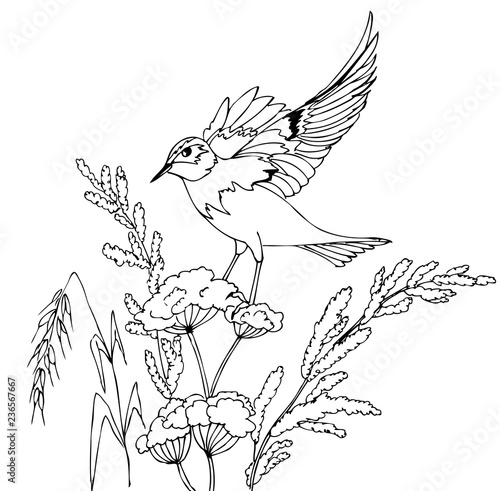 Obraz premium Bird sitting on a plant. Hand drawn illustrations for coloring