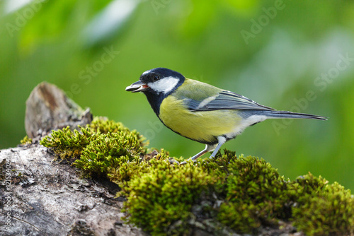 © Nitr, Naklejka premium bird sitting on wooden stump. Great Tit