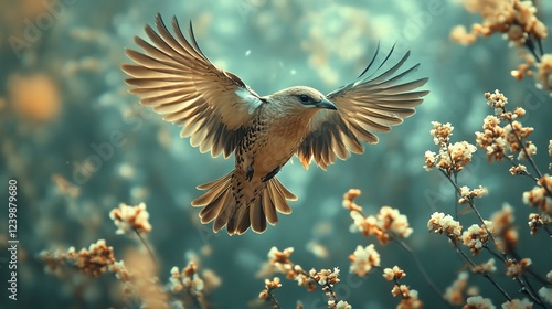 © Fridocha, Fototapeta premium Bird soaring over blooming flowers in a sunlit garden