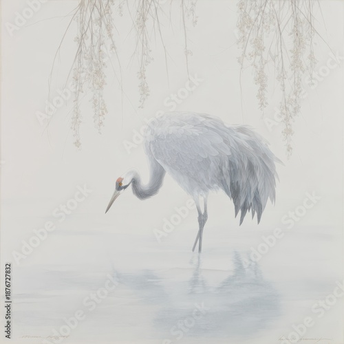© LyceeChee, Obraz premium Bird standing in shallow water, head bent down; weeping tree in the background
