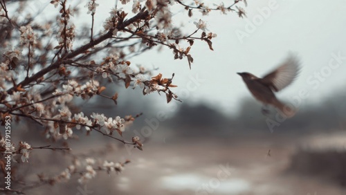 Obraz premium Bird taking flight from blossoming tree