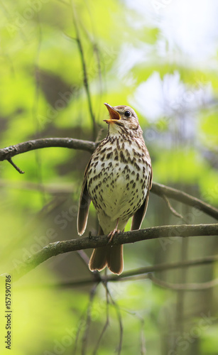 Fototapeta premium bird thrush sings loudly in the spring woods