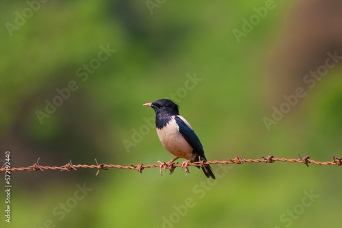Fototapeta premium bird watching around on wire, Rosy Starling, Pastor roseus