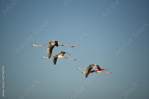 © Sherry, Fototapeta premium BIRDS- Bahamas- Close Up of Four Beautifully Colorful Flimingos in Flight