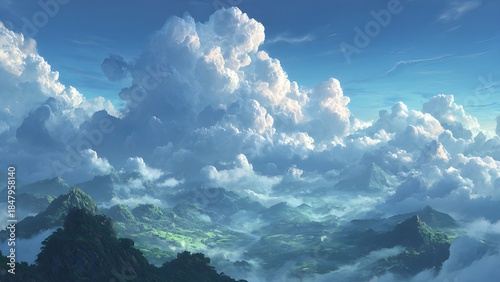 Fototapeta premium Birds-eye view of a whimsical green landscape with winding valleys and...