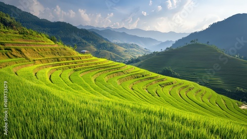 © Yopi, Fototapeta premium Birds Eye View of Golden Rice Farm in Rural Landscape with Lush Green Terraces and Mountains
