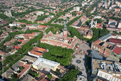 © Kirill, Obraz premium Birds eye view of Subotica City Hall on sunny summer day. Serbia.