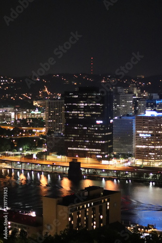 © Jessica Brouillette, Fototapeta premium Birds eye view of the city skyline of downtown Pittsburgh, Pennsylvania at night.