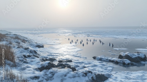 © dany, Obraz premium Birds flocking frozen coastal waters sunrise
