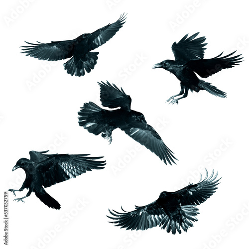 Obraz premium Birds flying ravens isolated on white background Corvus corax. Halloween - mix five birds