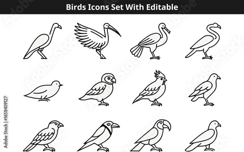 © nillgraph20, Naklejka premium Birds line icons set vector design with editable