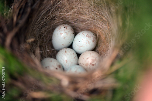© Nadzeya Kharuk, Obraz premium birds nest with blue and pink eggs in the garden