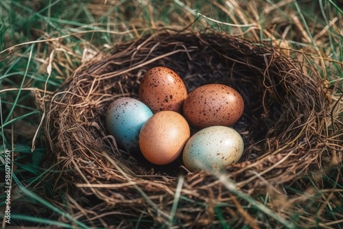 © AkuAku, Obraz premium birds nest with eggs created with Generative AI technology