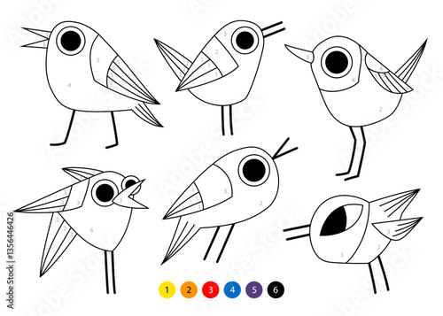 © zulidu, Fototapeta premium Birds page for kids. Coloring book for children. Vector outline illustration. Color by numbers.