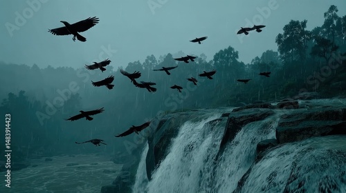 © Factory Stock, Fototapeta premium Birds silhouette over waterfall landscape