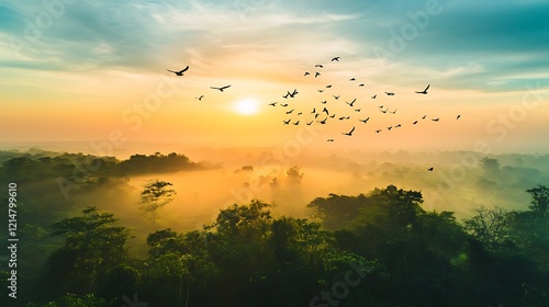 © Thirakun, Obraz premium Birds soaring in the sky above a protected green environment