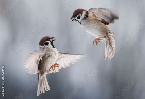 © nataba, Obraz premium birds sparrows sort things out spreading their wings and flying against the background of a winter garden