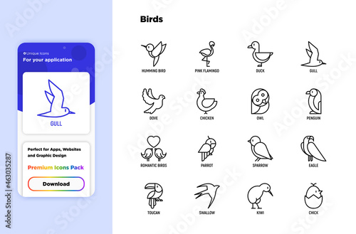 © AlexBlogoodf, Naklejka premium Birds thin line icons set: dove, owl, penguin, sparrow, swallow, kiwi, parrot, eagle, humming bird, pink flamingo. Modern vector illustration.