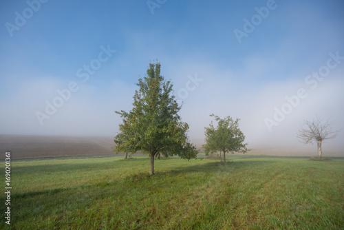 Obraz premium Birnbaum auf Streuobstwiese im Frühnebel