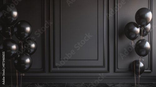 © INSPIRO SOURCE, Naklejka premium Birthday. Black Friday sale. Stylish black Background with black balloons. Holiday banner, web poster, flyer, cover card, Festive celebrate backdrop balloons, with copy space