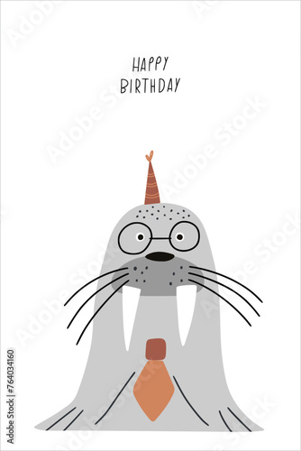 © Oleksandra Moryeva, Fototapeta premium Birthday card. Awesome cute walrus in birthday party hat, children's birthday party. Vector card with nice animal.