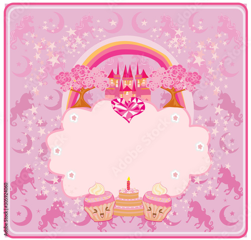 © diavolessa, Fototapeta premium Birthday card with birthday cake, muffins and castle