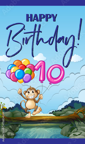 Fototapeta premium Birthday card with monkey and balloon number ten