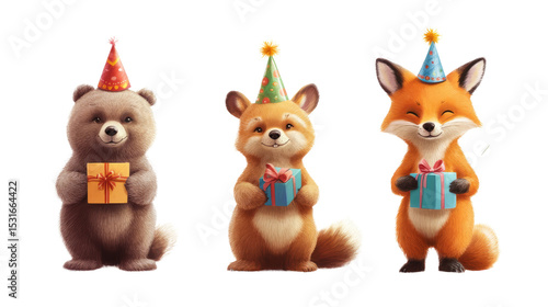 © Kornwit, Naklejka premium Birthday celebration with cute animal characters festive setting digital illustration cheerful atmosphere whimsical viewpoint